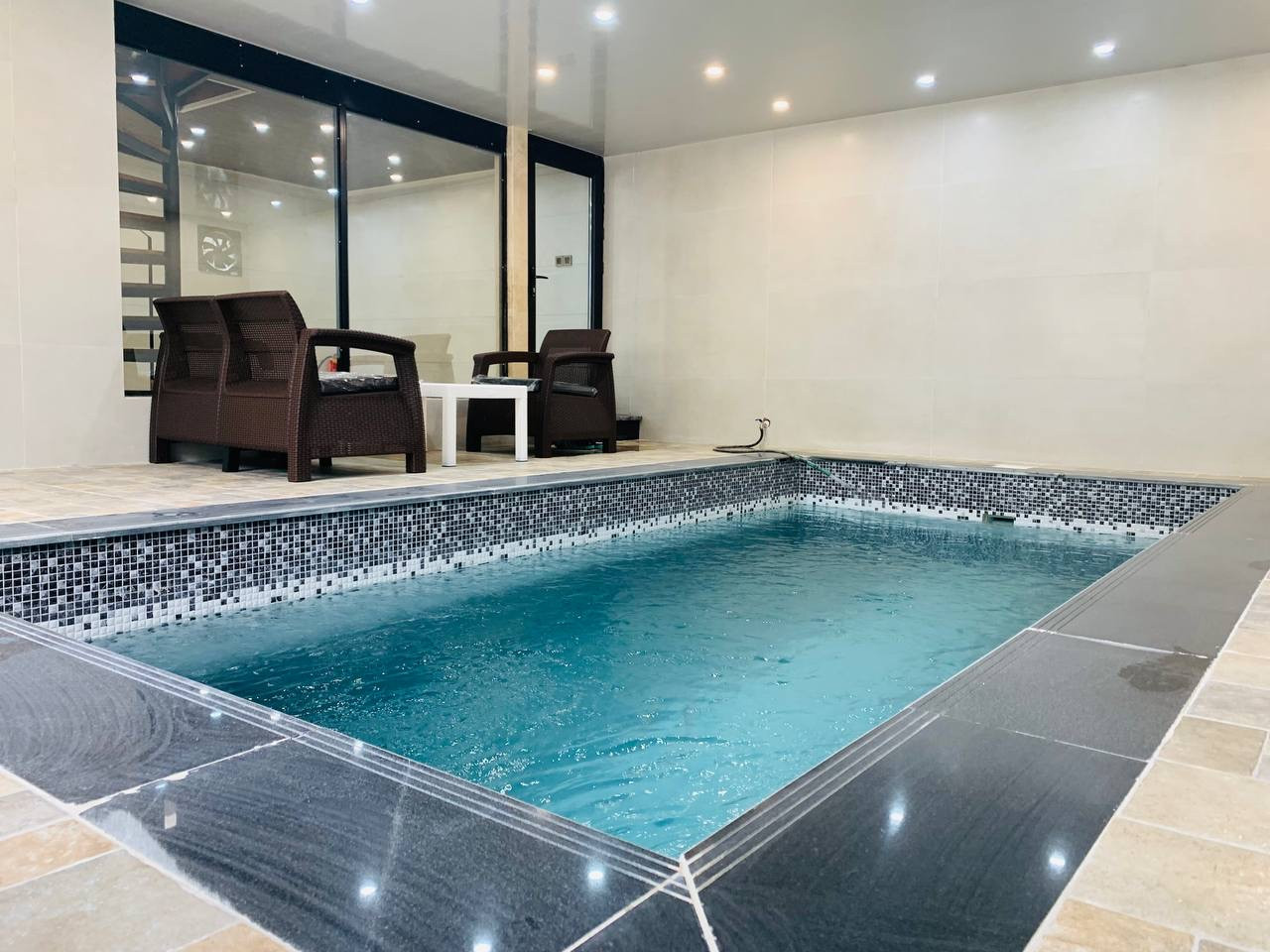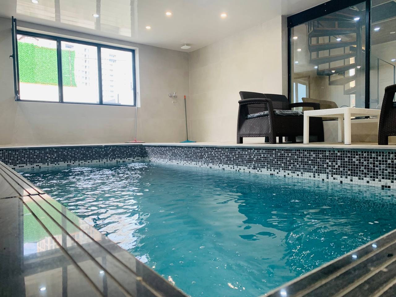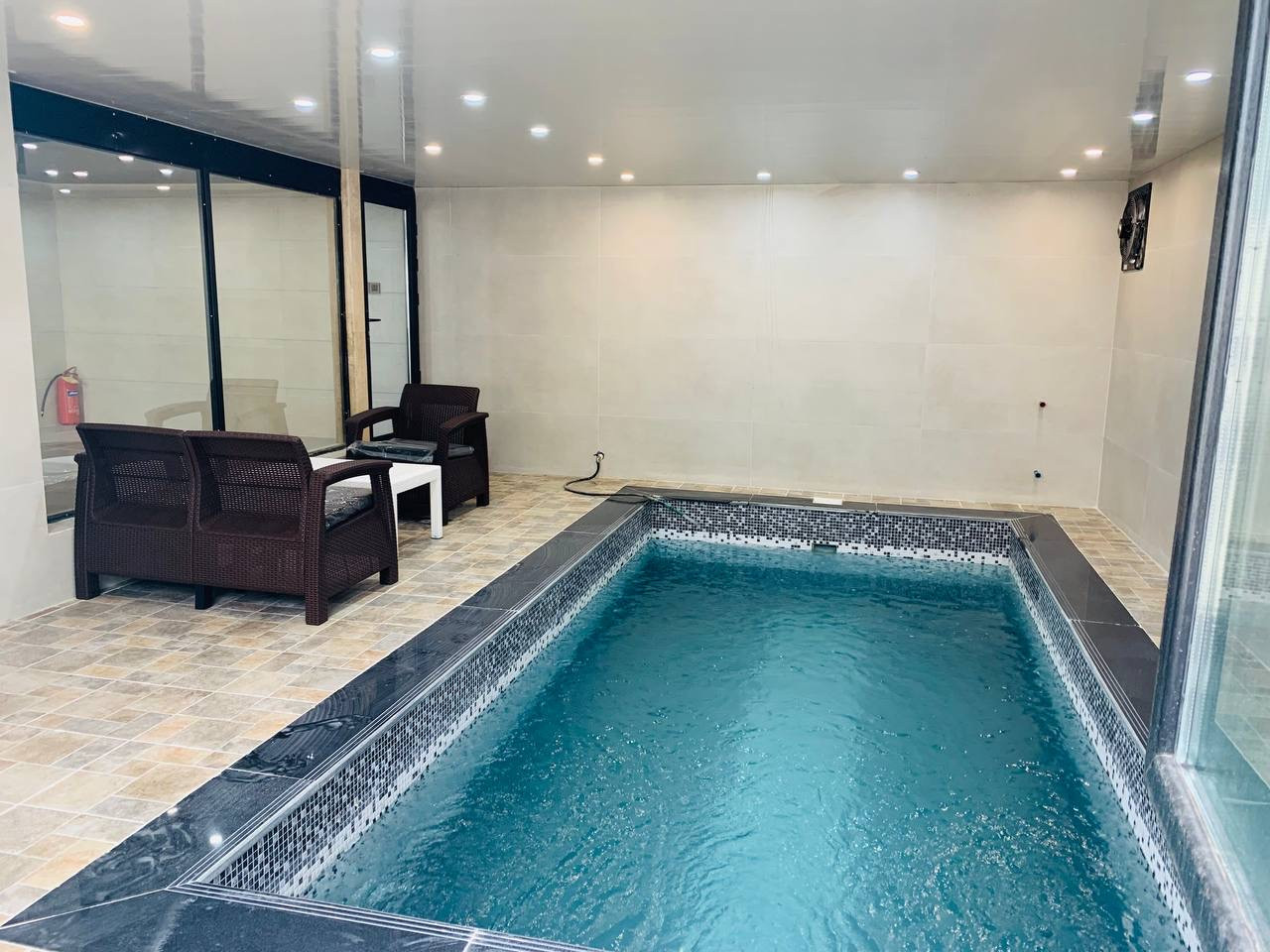 لديها حمام سباحة 2.5 × 5 مع عمق 1.5 متر.