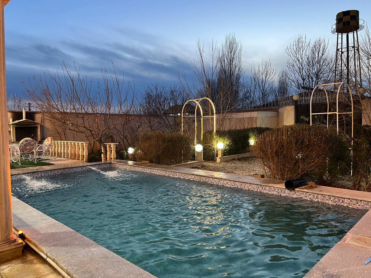آبیاری درختان و گیاهان باغ علی الخصوص با آب استخر ممنوع است درصورت ورود خسارت به لوازم ویلا و دختان و گیاهان باغ از میهمان عزیز خسارت دریافت میگردد.