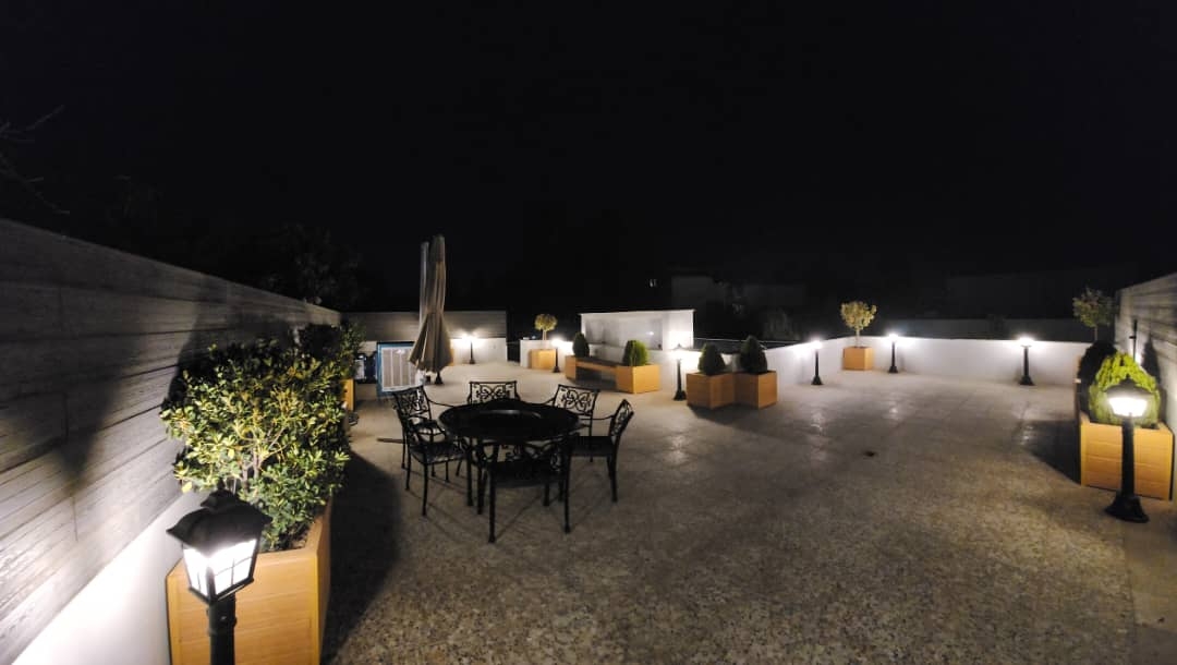 دارای روف گاردن به ابعاد 100 متری است.دارای چتر و صندلی 8 نفره است.مجهز به استخر روباز آبگرم به ابعاد 5 در 7 متری با عمق 1.5 لغایت 4 متری است.