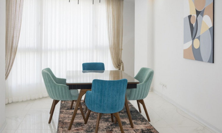 آپارتمان 2 خواب مبله در طبقه اول ساختمانی 5 طبقه 2 واحدی در طرشت قرار دارد و نمای ساختمان سنگ است.