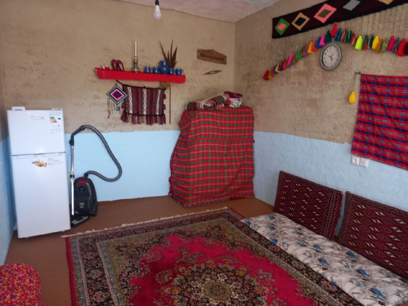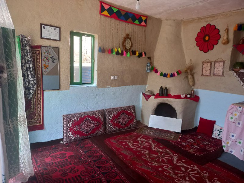 اقامتگاه کاهگلی سنتی و با صنایع دستی بومی و سنتی تزیین شده. منظره روبروی جنگل و مراتع سرسبز شمالی
